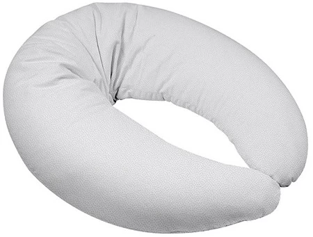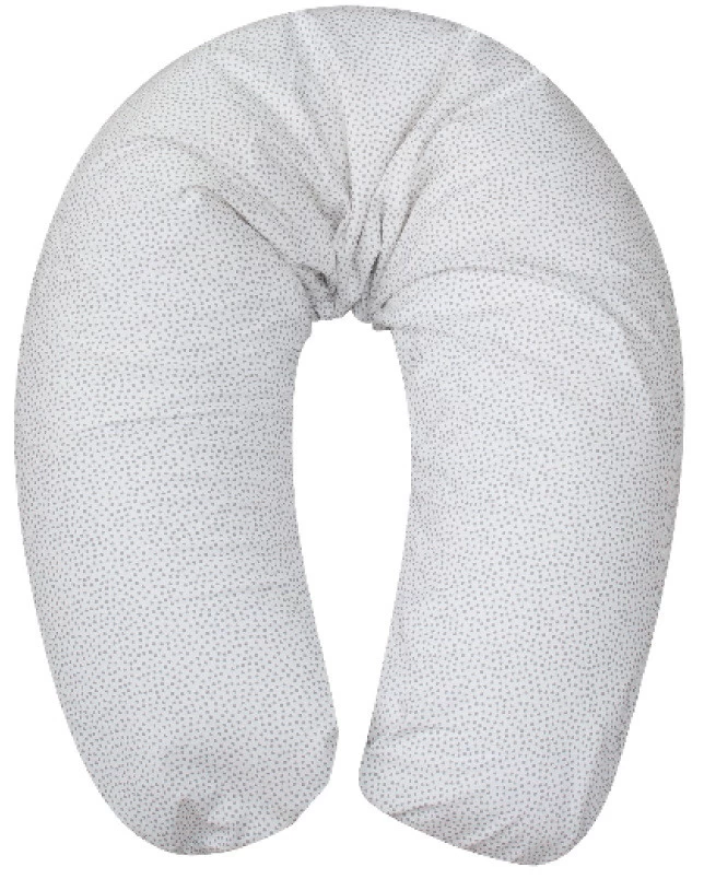 Het kussen is extra lang met een omtrek van 190 cm. De vulling bestaat uit hypoallergene microparels en kan geklasseerd worden als medisch hulpmiddel. De hoes is gemaakt van 100% katoen en voelt zacht aan. Dit voedingskussen is grijs en heeft een leuke stipjesprint.