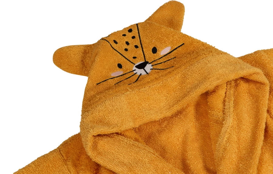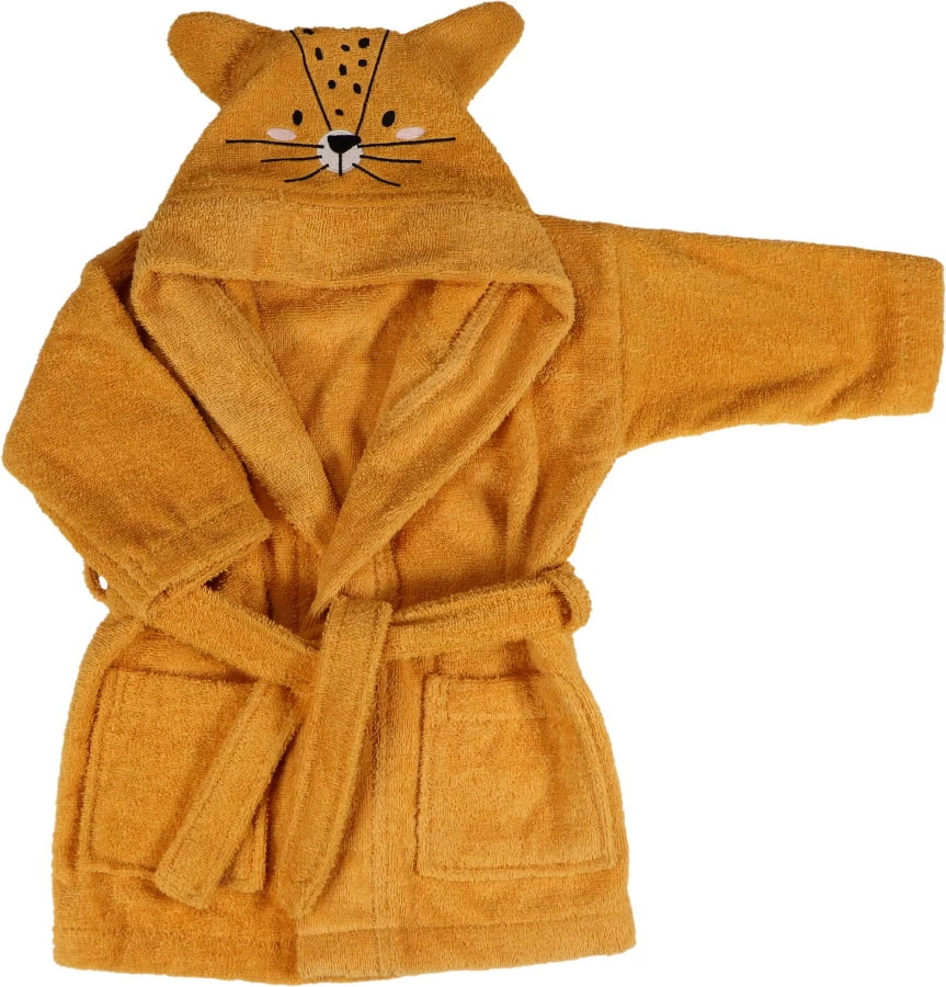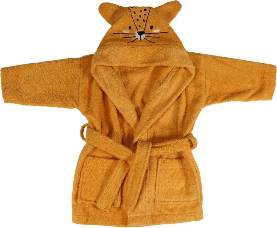 De badjas is extra leuk om aan te trekken want op de capuchon is een print van een luipaardje geborduurd! Zodra je kleine de capuchon op zet, zal hij/zij er dus uitzien als een echt luipaardje. De badjas heeft een riem die je zelf kunt knopen én twee zakjes.