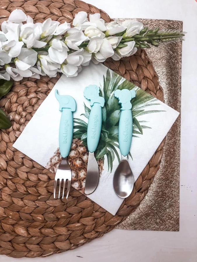 Het bestek heeft een siliconen handgreep in combinatie met roestvrij staal. De schattige dierenfiguurtjes (koala, leeuw en olifant) maakt het zelfstandig leren eten meteen stuk leuker! Smakelijk eten!