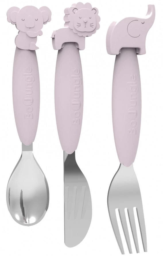 Het bestek heeft een siliconen handgreep in combinatie met roestvrij staal. De schattige dierenfiguurtjes (koala, leeuw en olifant) maakt het zelfstandig leren eten meteen stuk leuker! Smakelijk eten!