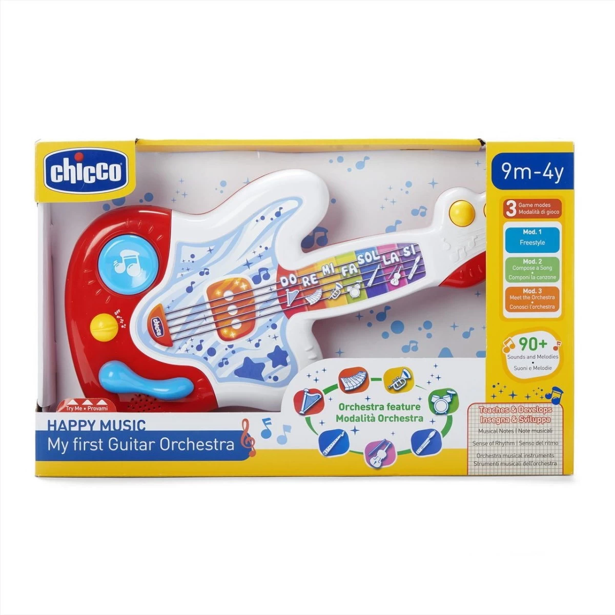 Met deze eerste gitaar kan je kleintje zelf aan de slag om leuke muziek te maken. Met 3 verschillende spelopties en meer dan 90 geluiden en melodieën kan je kindje eindeloos ontdekken. In de eerste spelmodus kan je kleine freestylen en helemaal zelf bepalen wat hij of zij speelt. De tweede optie is het maken van een liedje waarbij een melodie wordt verdeeld in kleine stukjes en je kleine wordt uitgedaagd om deze af te maken. Als laatst kan je kleine gitarist ook verschillende instrumenten ontdekken via de 8 interactieve knoppen op de gitaar. Met de gele draaiknop aan de onderkant wissel je van speelmodus.