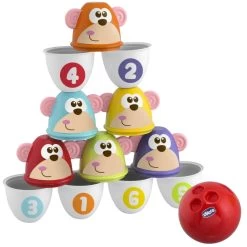 Wat zal jouw kleine veel plezier beleven met dit leuke Monkey Strike Bowlingspel van Chicco! De set wordt geleverd met 6 vrolijk gekleurde kegels met het hoofdje van een aapje erop en een zacht plastic balletje.