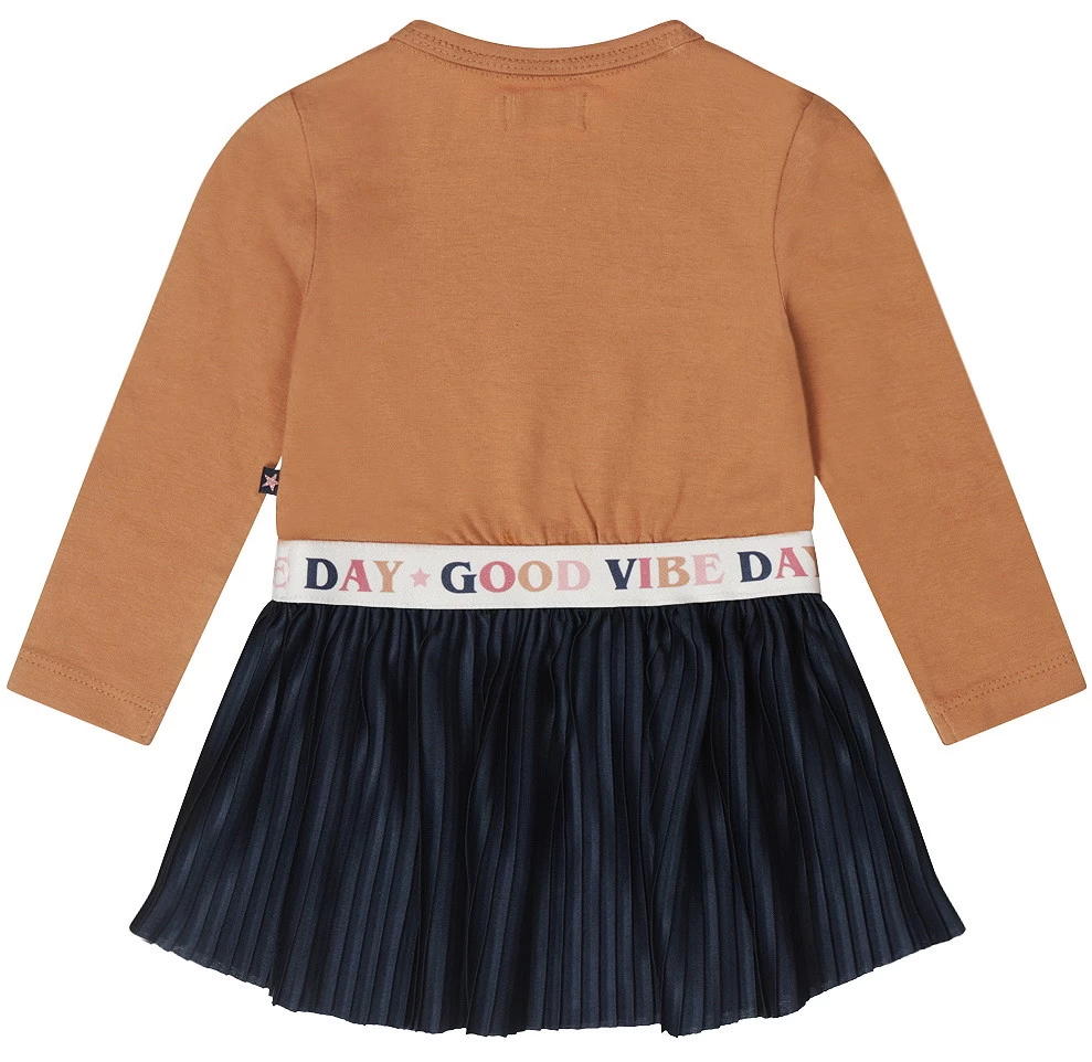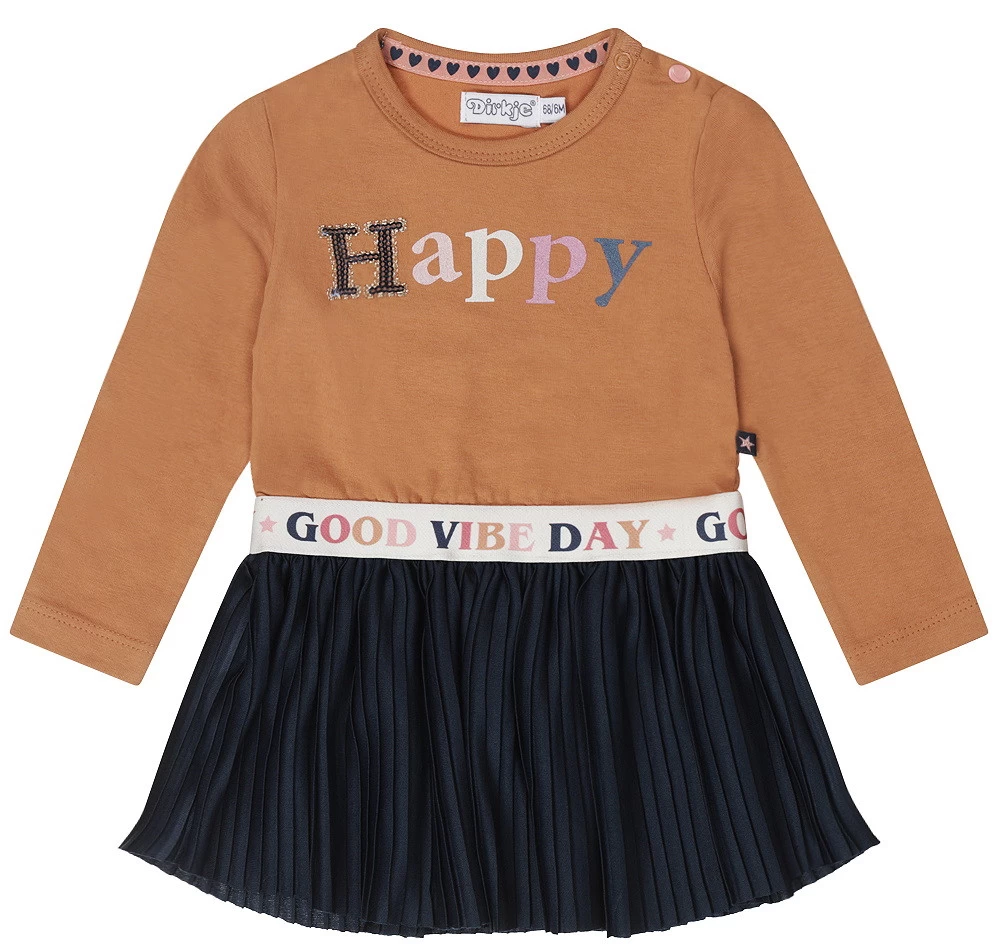 Met dit schattige jurkje uit de herfst/winter ’23 collectie van Dirkje wordt elke dag een goede dag! Het jurkje met lange mouwen heeft de tekst ‘Happy’ en een zwierig rokje eraan vast. De tailleband met ‘Good Vibe Day’ maakt hem nog leuker!