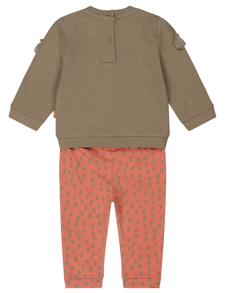De tui met lange mouwen is afgewerkt met lief broderie randje. Het broekje is heerlijk zacht en heeft een all-over stippenprint in dezelfde kleur als de trui. Dankzij de drukkertjes kun je de kleding gemakkelijk aan- en uit doen. De set is gemaakt van comfortabel en flexibel materiaal, zodat je kindje vrij kan bewegen.