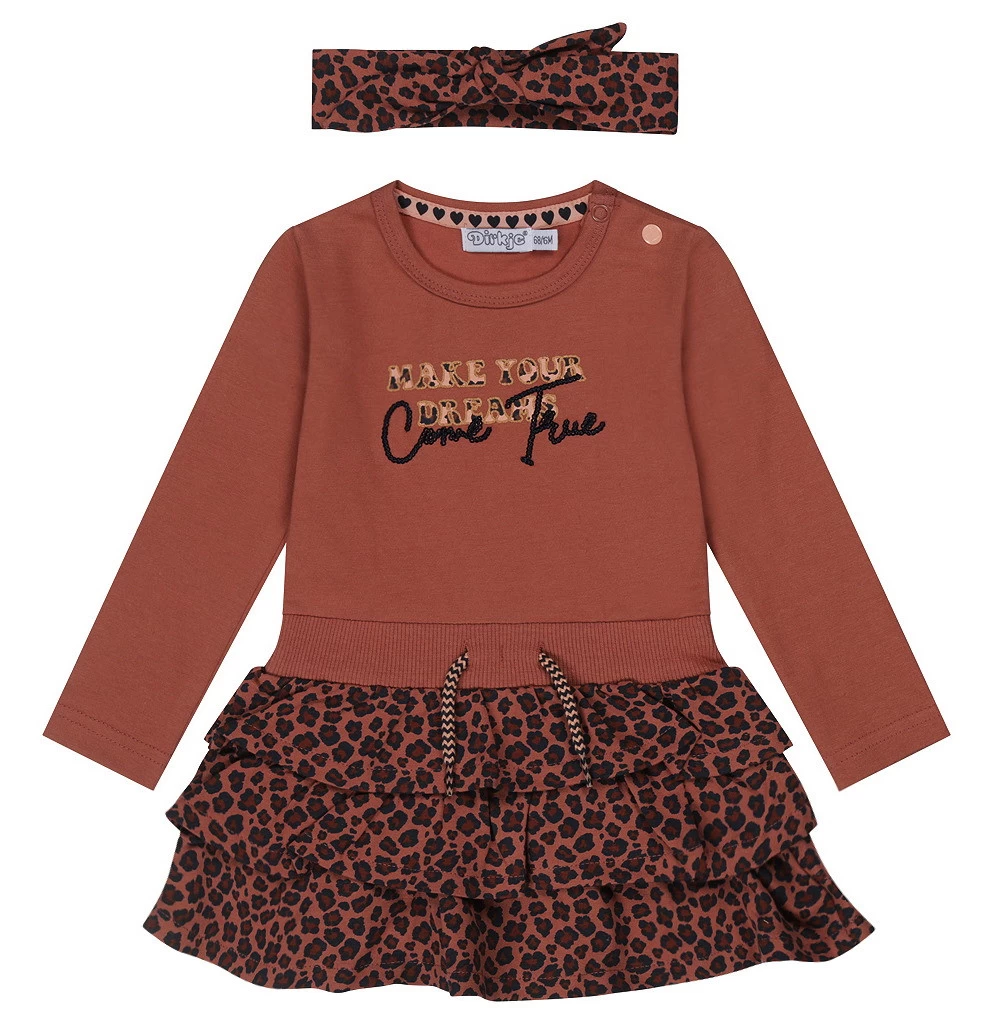 Wat zal dit jurkje uit de herfst/winter ’23 collectie van Dirkje jouw kleine meid super staan! Het jurkje met lange mouwen heeft een schattige rok met all-over panterprint en is afgewerkt met een sierkoordje.
