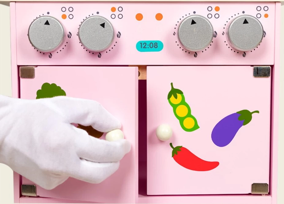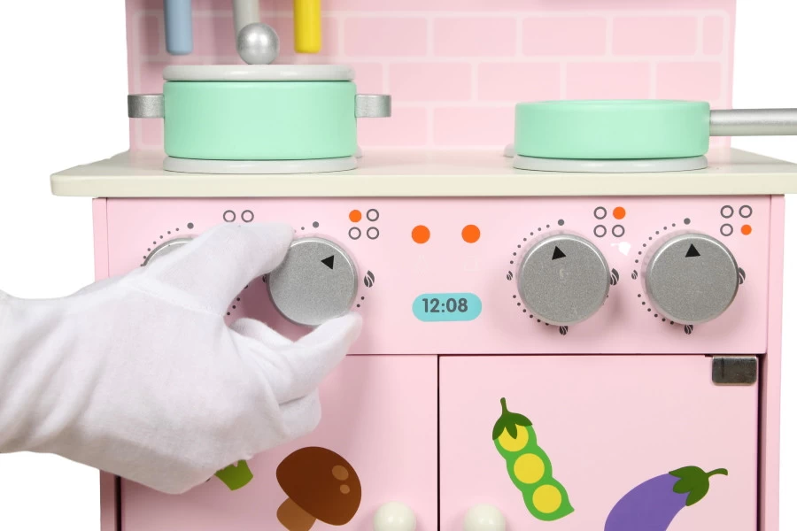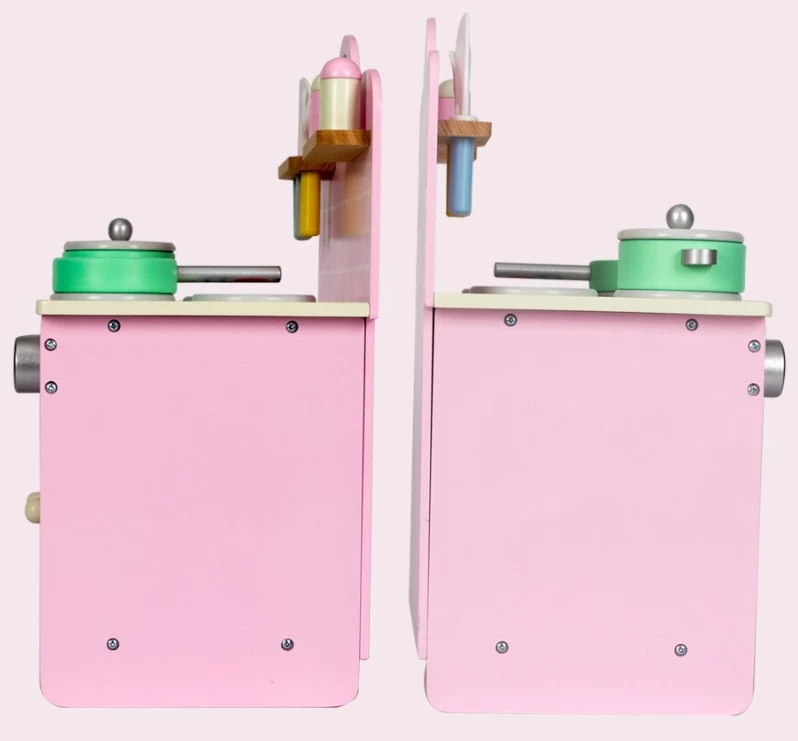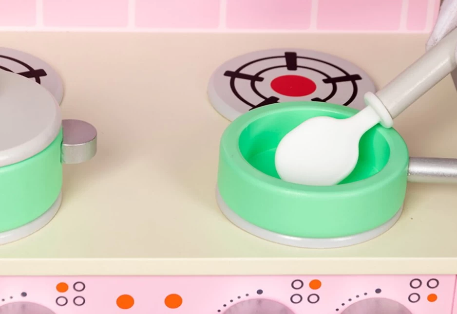 Het keukentje wordt geleverd met 7 accessoires, namelijk een steelpan, kookpan, peper- en zoutstel, lepel, vork en mes. Dus je kindje kan zich helemaal uitleven. De deurtjes kunnen geopend worden voor extra opbergruimte en aan de knopjes van het fornuis kan gedraaid worden. Het lijkt net echt!