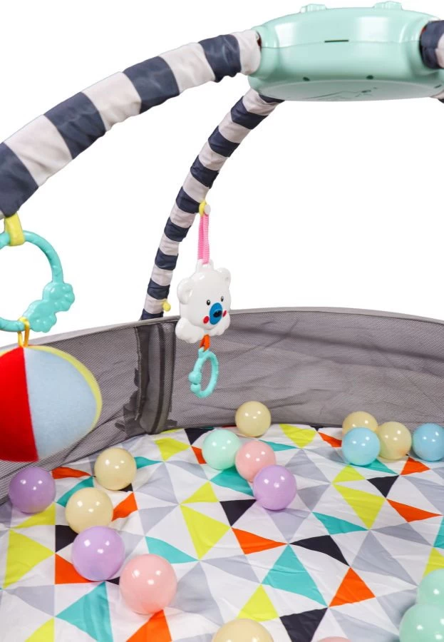 Het Triangle speelkleed is op drie manieren te gebruiken, namelijk als los kleed, als kleed met speelboog en als ballenbak. Hij heeft een diameter van 100 cm en wordt geleverd met maar liefst 40 ballenbakballen! De speelboog heeft verschillende (afneembare) speeltjes en heeft een unit waarmee je verschillende liedjes kan afspelen.