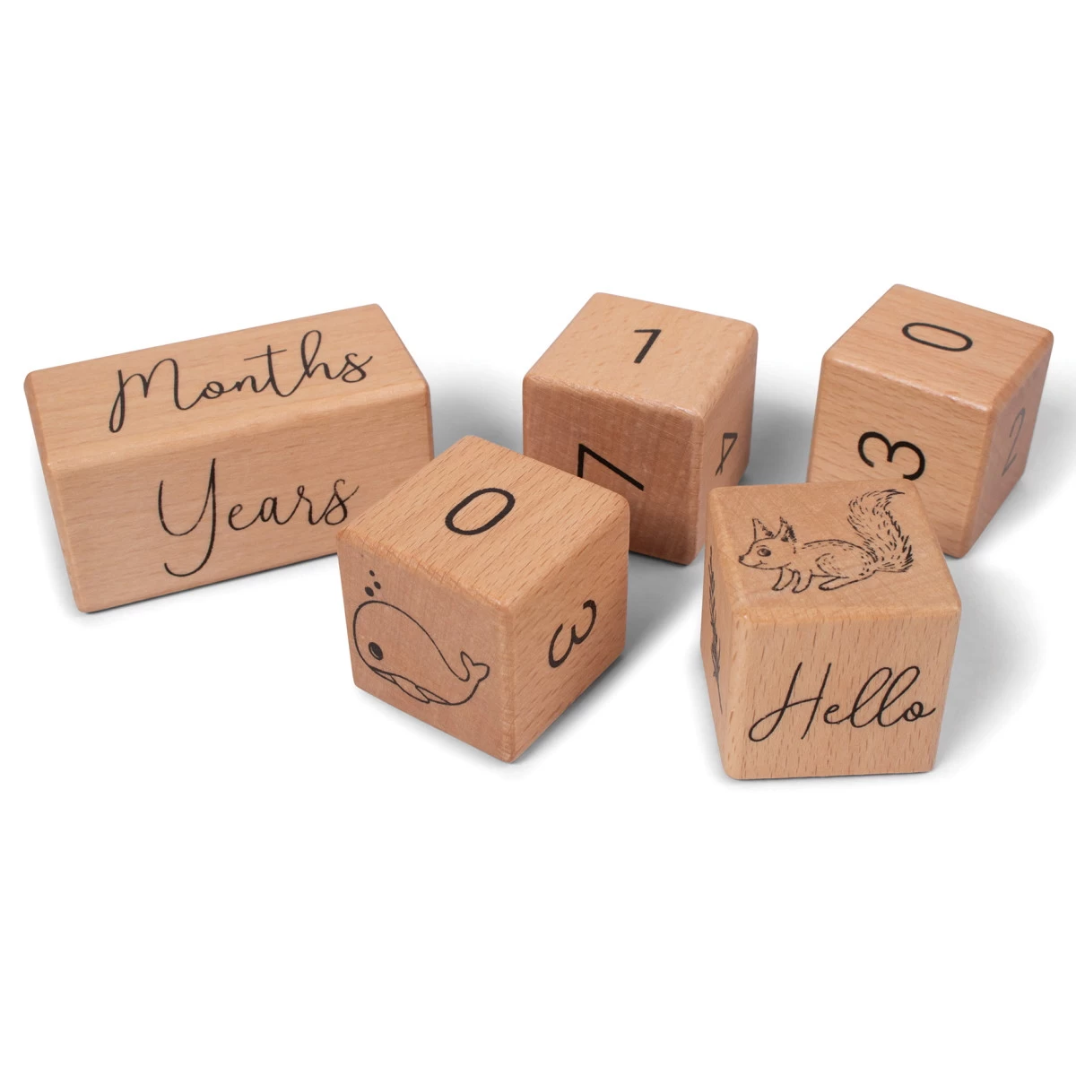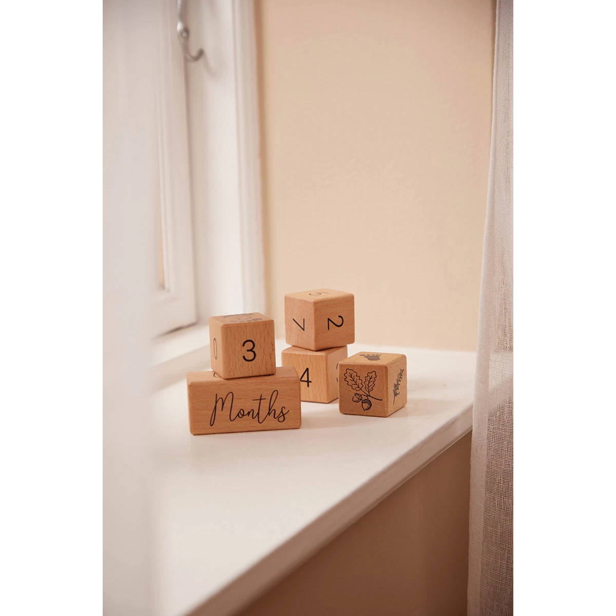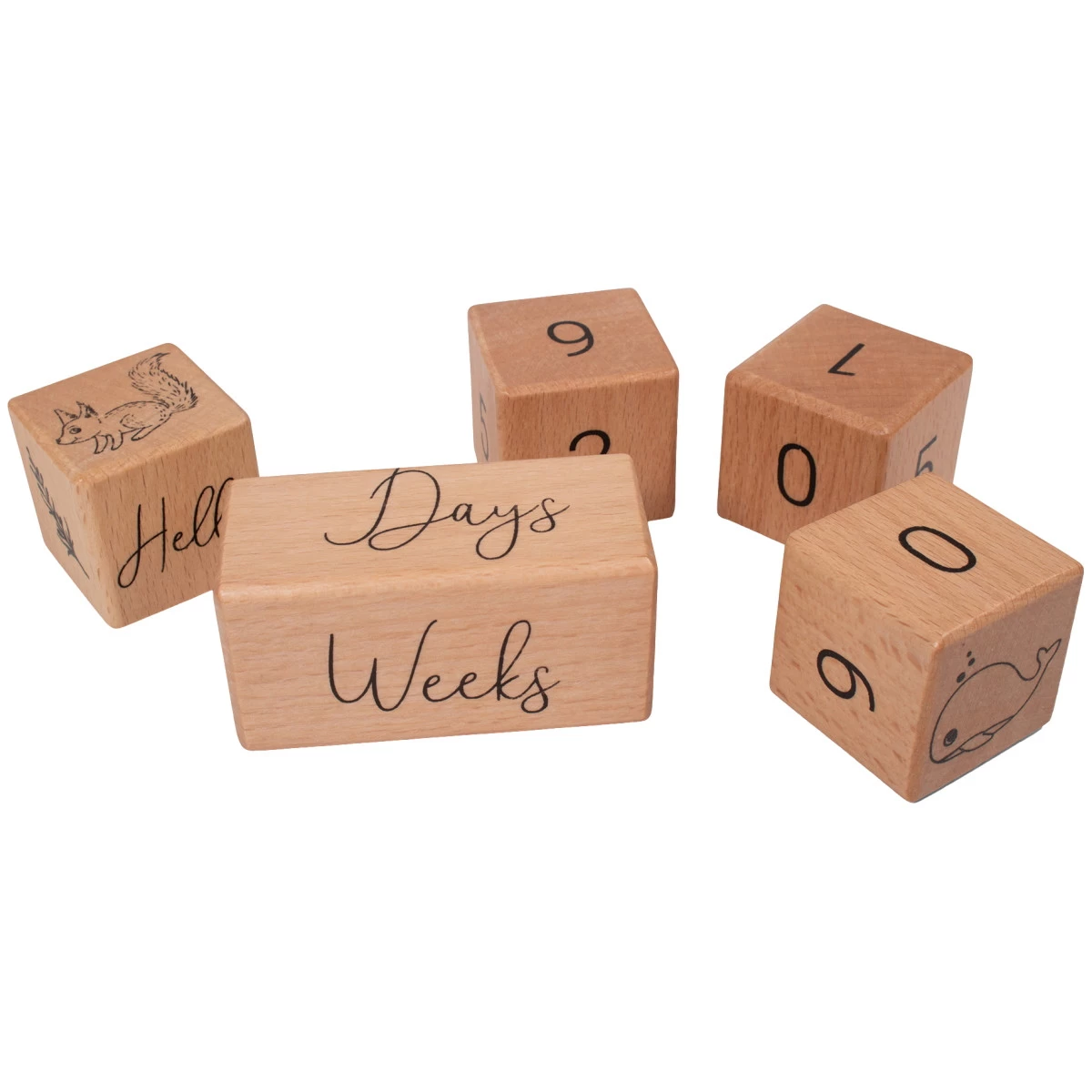De blokken zijn ideaal om de leeftijd van je kindje aan te geven, of om te laten zien hoe lang je in verwachting bent. De kleine blokken bevatten naast schattige illustraties de cijfers 0-9 en het grote blok de Engelse woorden ‘days’, ‘weeks’, ‘months’ en ‘years’. Ze zijn gemaakt van stevig beukenhout en hebben afgeronde hoeken zodat ze ook veilig zijn voor je kindje om mee te spelen.
