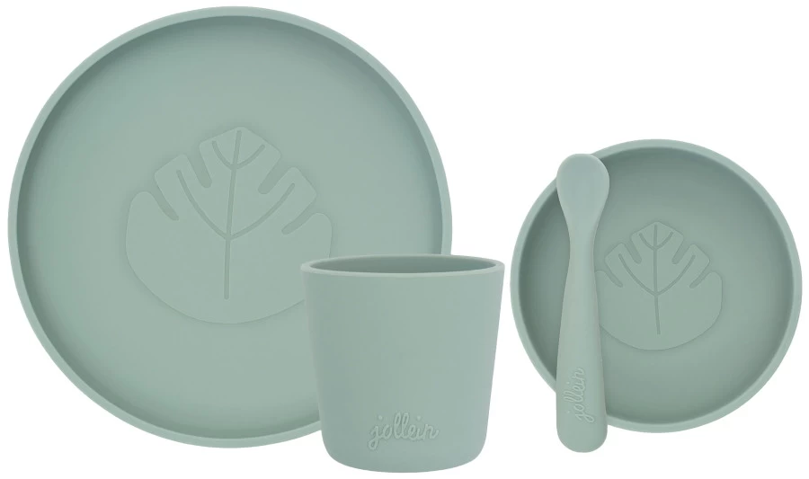Samen met je kindje lekker tafelen wordt een feestje met deze mooie dinerset van Jollein! Deze schattige 4-delige set bestaat uit een bord, kommetje, beker en lepel en heeft de kleur Ash Green. Dankzij de handige zuignappen onder zowel het bordje als kommetje zal je kindje de spulletjes niet meer om kunnen stoten en wordt er minder geknoeid!