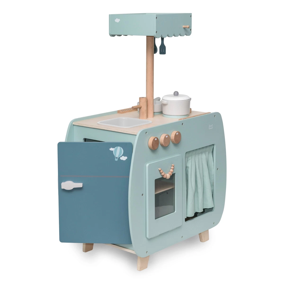 Een appeltaart of de lekkerste cupcakes bakken is met dit kookeiland geen probleem. Het keukentje beschikt over een magnetron, oven, koelkast, verschillende opbergvakjes, een wasbak, een fornuis, een afzuigkap en een kraantje. Maar je kunt natuurlijk niet iets koken zonder keukengerei of pannen, daarom zitten er 2 pannetjes, een lepel, een spatel en een echte koksmuts bij inbegrepen. Is jouw kindje klaar met koken? Dan kan het keukengerei makkelijk worden opgehangen aan de afzuigkap, de pannetjes kunnen terug in de kastjes of achter het gordijntje worden opgeborgen. Opgeruimd staat netjes.
