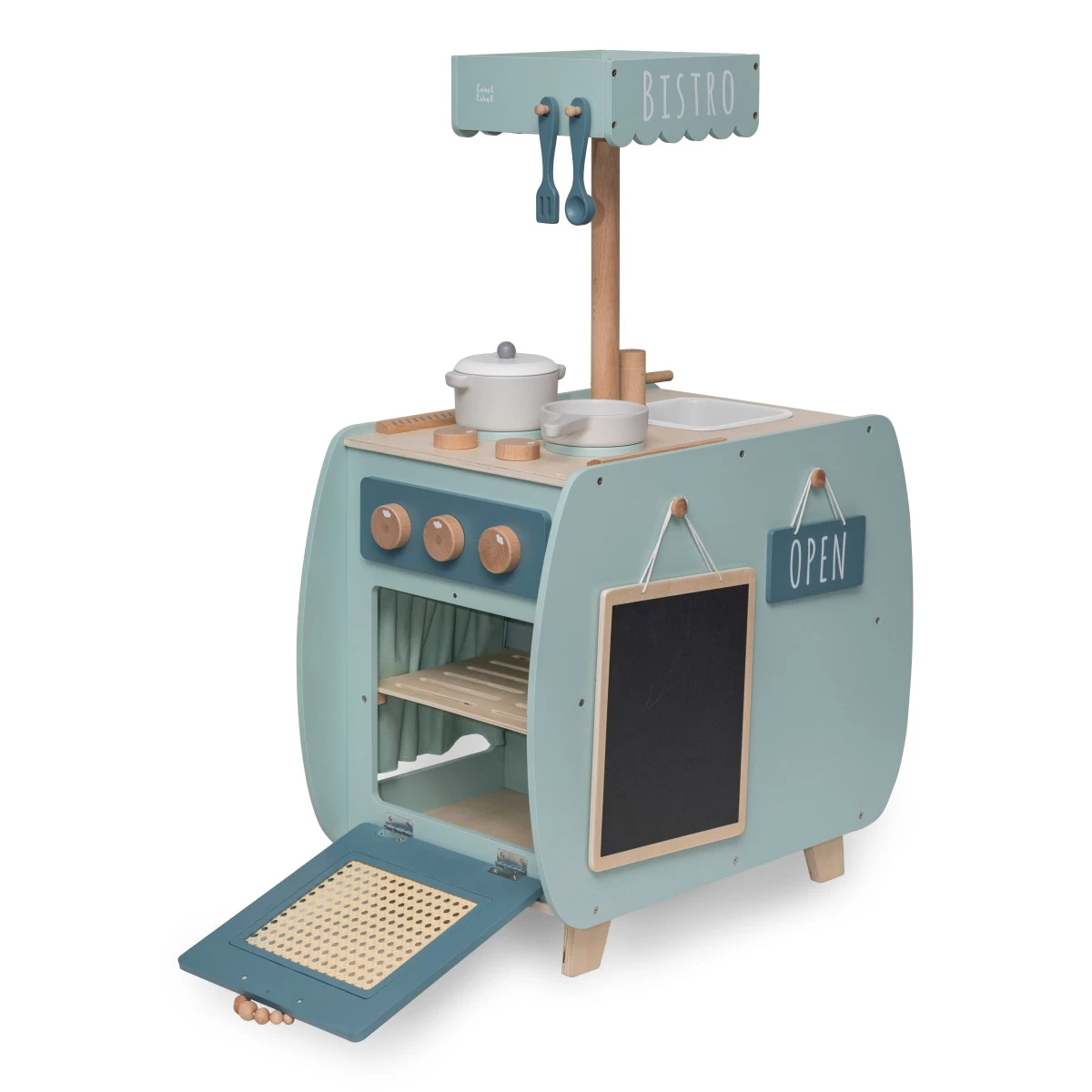 Bij een echt restaurant kun je natuurlijk ook niet zomaar binnenlopen en hopen dat de kok aanwezig is, hiervoor heb je een geopend bordje nodig. Ook de menukaart mag niet ontbreken, met het handige krijtbord inclusief krijtjes kan jouw kindje iedere dag een ander menu bedenken en op de kaart zetten. Superhandig, zo weet jij wat je op je bord krijgt als je bij de kleine chef-kok gaat eten.