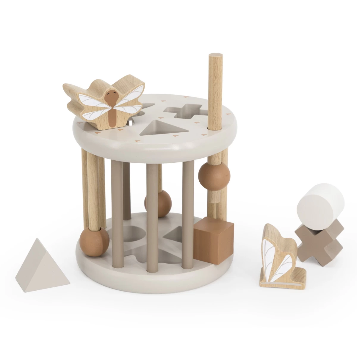 Deze houten vormenstoof van Label Label ziet er niet alleen leuk uit met de nougat kleur, maar je kindje kan er ook heerlijk mee spelen. De vormenstoof heeft verschillende openingen waar de 6 vormpjes in geduwd kunnen worden. Omdat de vormenstoof rond is kan je kleine deze over de grond rollen, dit is extra leuk en uitdagend wanneer je kindje net kan kruipen!