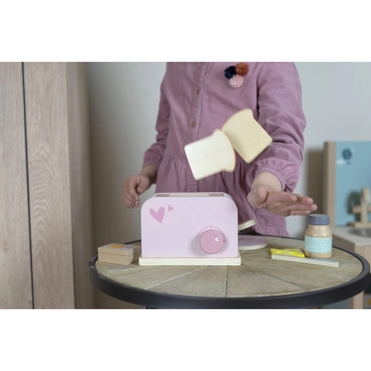 Je kleine kan heerlijk geroosterd brood maken in dit mooie houten broodrooster van Label Label! Deze set bestaat uit een broodrooster, 2 boterhammen, 2 brodjes, 2 plakjes kaas, botervlootje, 2 mesjes en een potje jam.