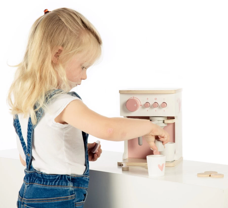 Met de houten espresso machine van Label Label kan je kleine ’s ochtends een heerlijk kopje koffie met je meedrinken! Met deze machine kan je kleine oefenen om een echte barista te worden. Je kleine kan zelf kiezen om één of twee kopjes koffie te zetten.