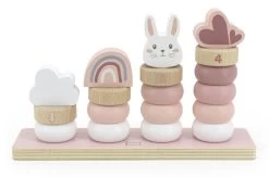 Van stapelen, tellen en sorteren tot fantasierijke verhaaltjes over regenbogen en konijntjes, wat zal je kleintje heerlijk kunnen spelen met deze superleuke houten stapelringen van Label Label!