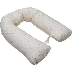 Het voedingskussen heeft een mooie print en een uni-kleurige kant: hierdoor kun je zelf kiezen welke kant je boven legt. Daarbij is hij voorzien van een afritsbare hoes die met de hand gewassen kan worden. Om de ronden vorm te behouden als je kleintje er op zit of tijdens het voeden, zitten er 2 touwtjes aan het einde van het voedingskussen die aan elkaar geknoopt kunnen worden. De lengte van het voedingskussen is 155 cm.