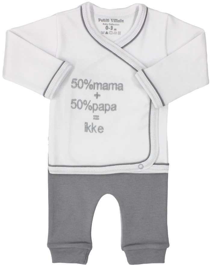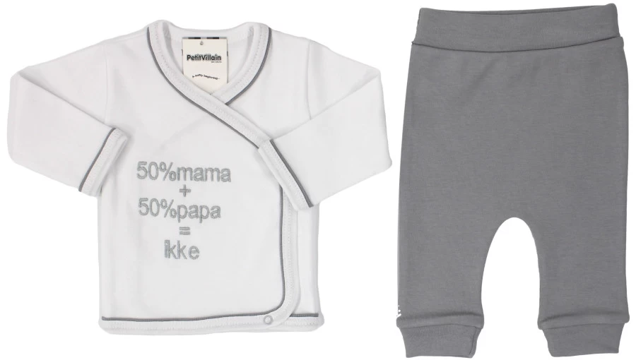 Je kleine zal helemaal stralen in dit leuke setje van Petit Villain! Deze set bestaat uit een comfortabel broekje in de kleur grijs en een wit met grijs truitje met lange mouwen met daarop de tekst ‘50% mama + 50% papa = ikke’.