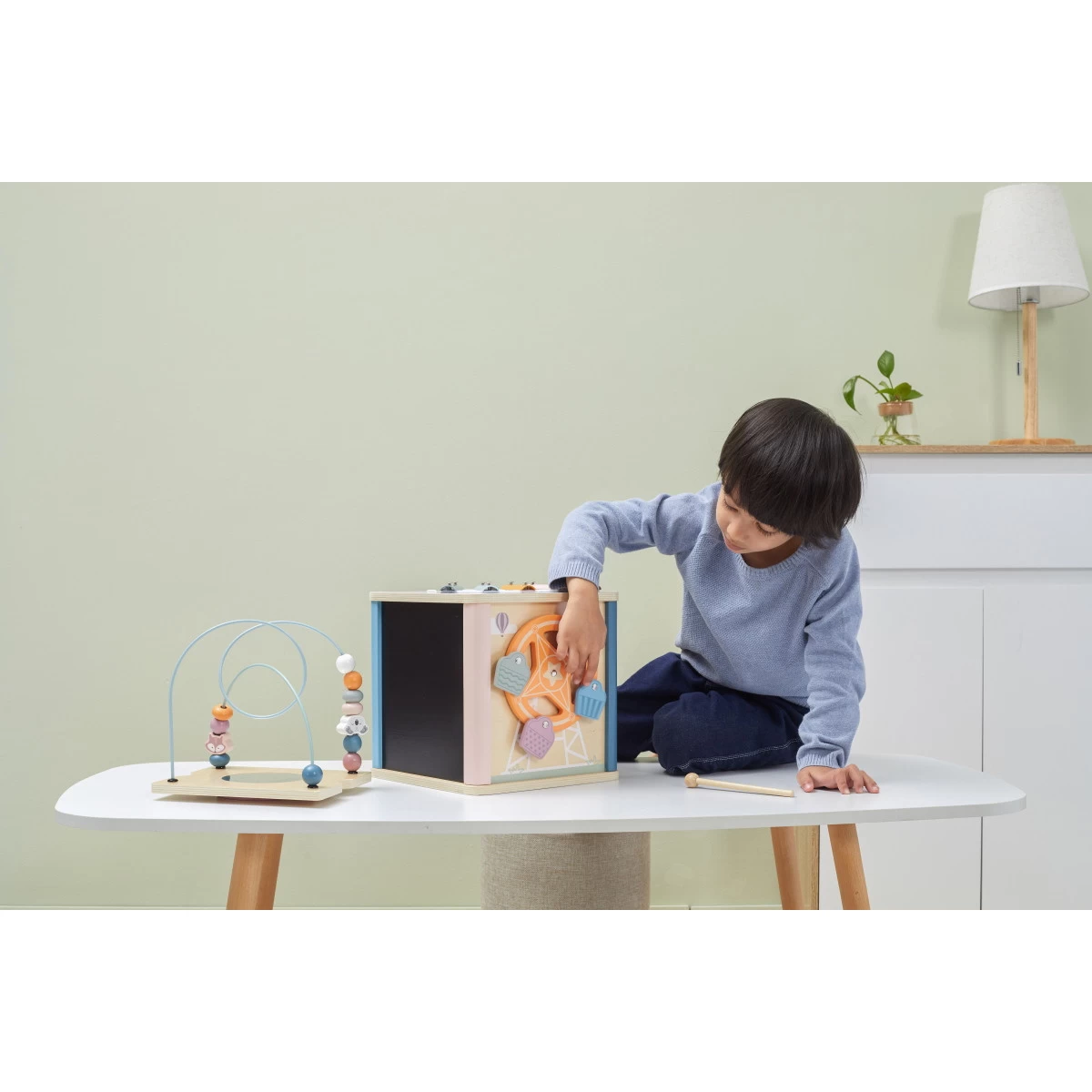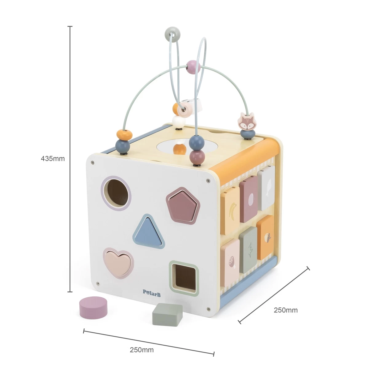 Deze leuke 8-in-1 Activiteiten Box van PolarB zit vol met verrassingen! De multifunctionele box heeft leuke pastelkleurtjes en plaatjes. Aan elke kant van de box zit een nieuw speelgoed dat je kindje kan verkennen. De activiteiten box bestaat uit: een verwijderbare kralenspiraal, deurtjes met daarachter een verrassing, een vormenstoof met verschillende vormpjes, een spiegel, een xylofoon met hamertje, een interactieve draaischijf met cupcakes, een krijtbord en een grabbelton waar je kindje zijn/haar vormpjes weer uit kan vissen.