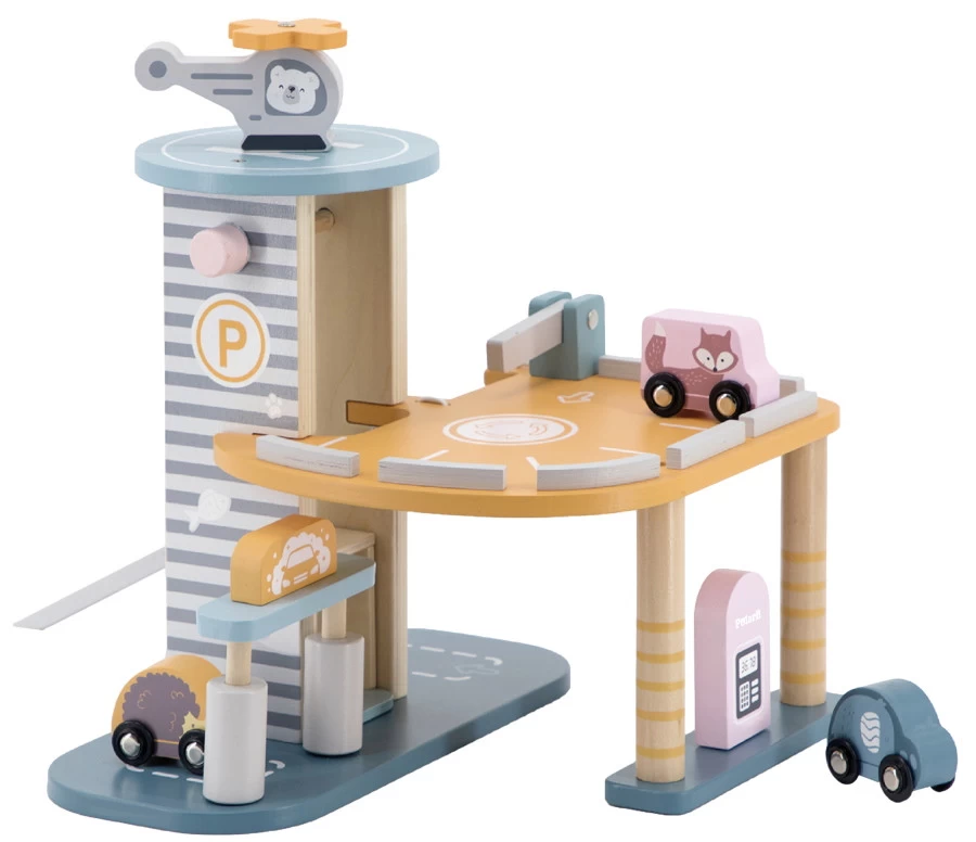 Wat zal je kindje eindeloos spelen met deze toffe Houten Parkeergarage van PolarB! De garage is gemaakt van stevig hout en is voorzien van verschillende accessoires die zorgen voor veel speelplezier. Zo heeft de garage bijvoorbeeld een slagboom, een lift en wordt hij geleverd met drie leuke dierenauto’s en een helikopter.