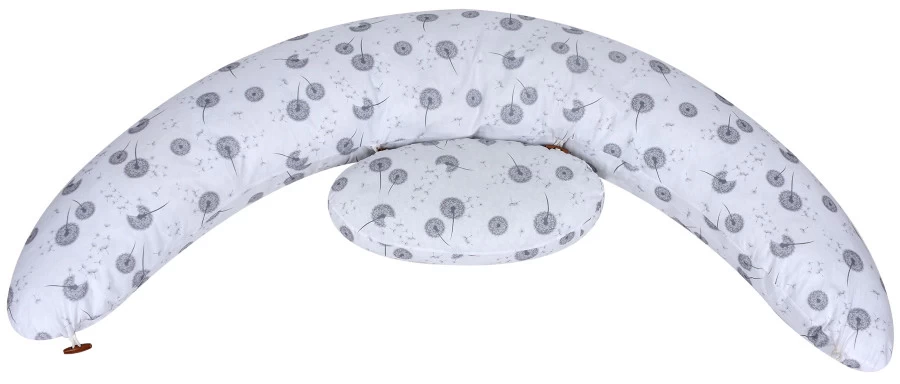 Het voedingskussen is voorzien van een hoes die gemaakt is van 100% katoen. Om ervoor te zorgen dat het voedingskussen rond blijft staan als je kleine er op zit of tijdens het voeden zit er een knoop aan het einde van het voedingskussen. Verder bestaat de vulling uit holle vezels. Het kussen is 195 cm lang en heeft een diameter van 35 cm.