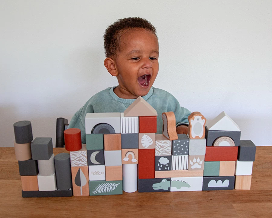 Deze blokkenset bestaat uit 50 stuks blokken. De blokjes zijn gemaakt van degelijk hout en hebben verschillende vormen, kleuren én printjes! Zo zullen de o.a. de dinosaurus, krokodil en ijsbeer het kindje vergezellen tijdens het bouwen.