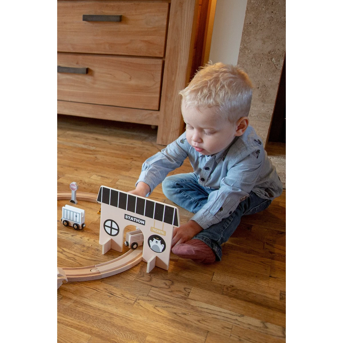 De treinbaanset is gemaakt van hout en is geschikt voor kindjes vanaf 3 jaar. Doordat alle wagonnetjes met magneet bevestigd worden is deze treinbaanset super veilig. De set bestaat uit: 17 railsdelen, 2 brughouders, 1 locomotief, 3 wagonnetjes, 1 stoplicht, 1 stopbord en een station (met 2 pootjes).